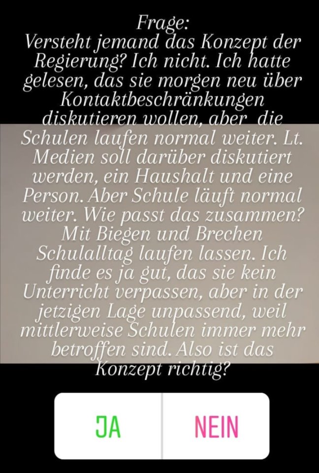 Ich finde, wir sollten die Schulen, solange in Szenario B laufen lassen, wie die Kontaktbeschränken. Busse sind brechen voll. Abstand kann nicht gewahrt werden, Masken werden nicht immer getragen und dann wundern sich alle, dass die Zahlen steigen? Es ist wichtig, das die Schule normal läuft, abet nicht unter diesen Umständen. Bei uns im LK sind bereits geschlossen oder befinden sich in Szenario B. Glaubt denn die Regierung, das um die Schule ein Bogen gemacht wird? Fakt ist, das es so nicht ist. Die Schüler sind genauso betroffen, wie die Erwachsen und den ganzen Tag eine Maske tragen, ist auch nicht so toll. Also, was meint ihr? Es ist meine Meinung, aber jeder Mensch hat eine andere Meinung.