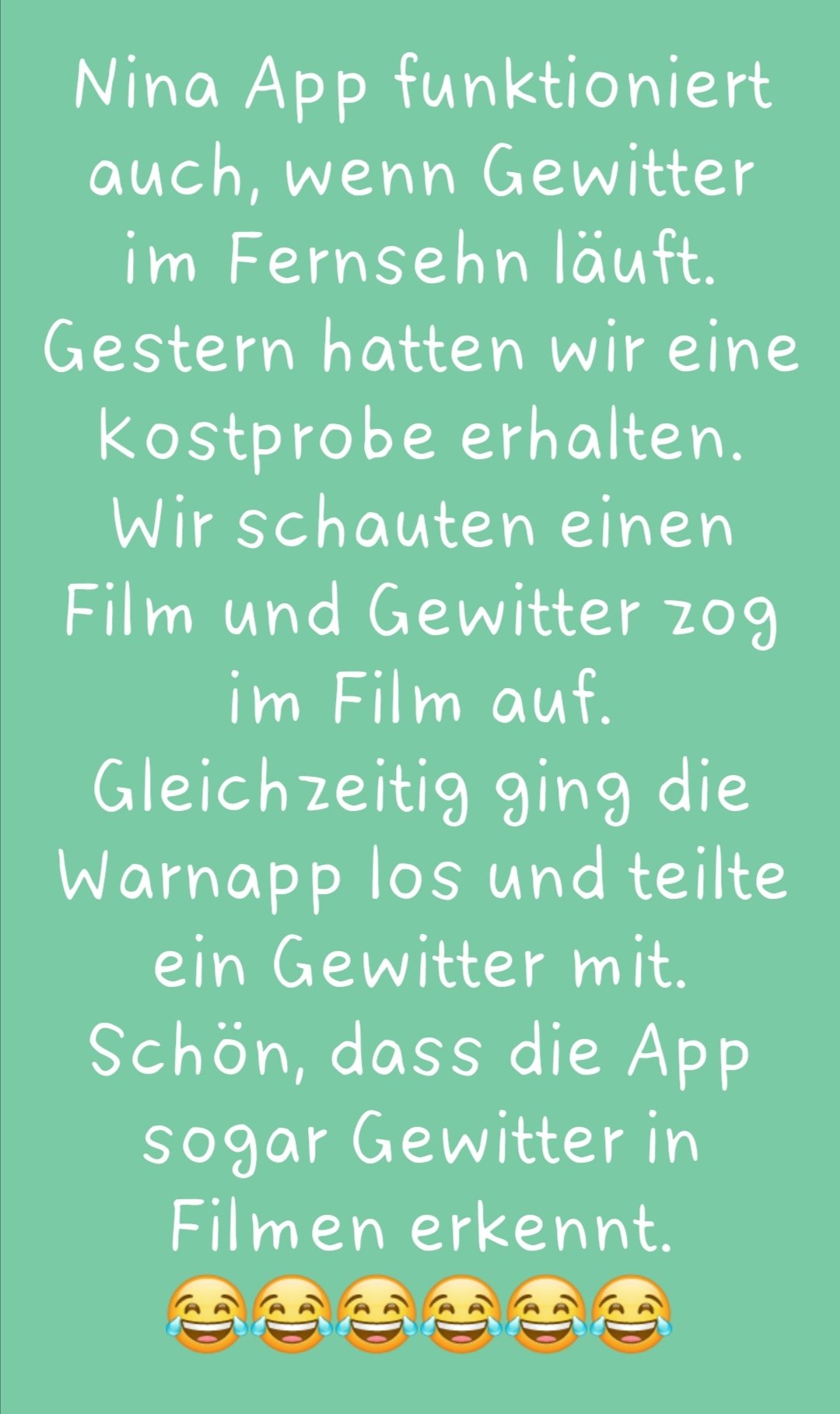 Das ist uns gestern passiert. Natürlich reagiert es nicht auf Unwetter im TV. Witzig war es schon, als im Film jemand sagte, es zieht Unwetter auf und im gleichen Moment die App sich meldete. Wir mussten lachen und Witze reissen. Mein Mann sagte, passt. Sogar Hagel mit Sturm.